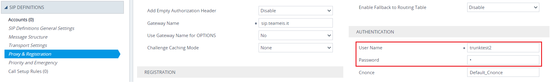 Per inserire la password del Trunk, è necessario spostarsi nel menu SIP Definitions→Proxy & Registration sempre all'interno della sezione Setup→Signaling & Media.