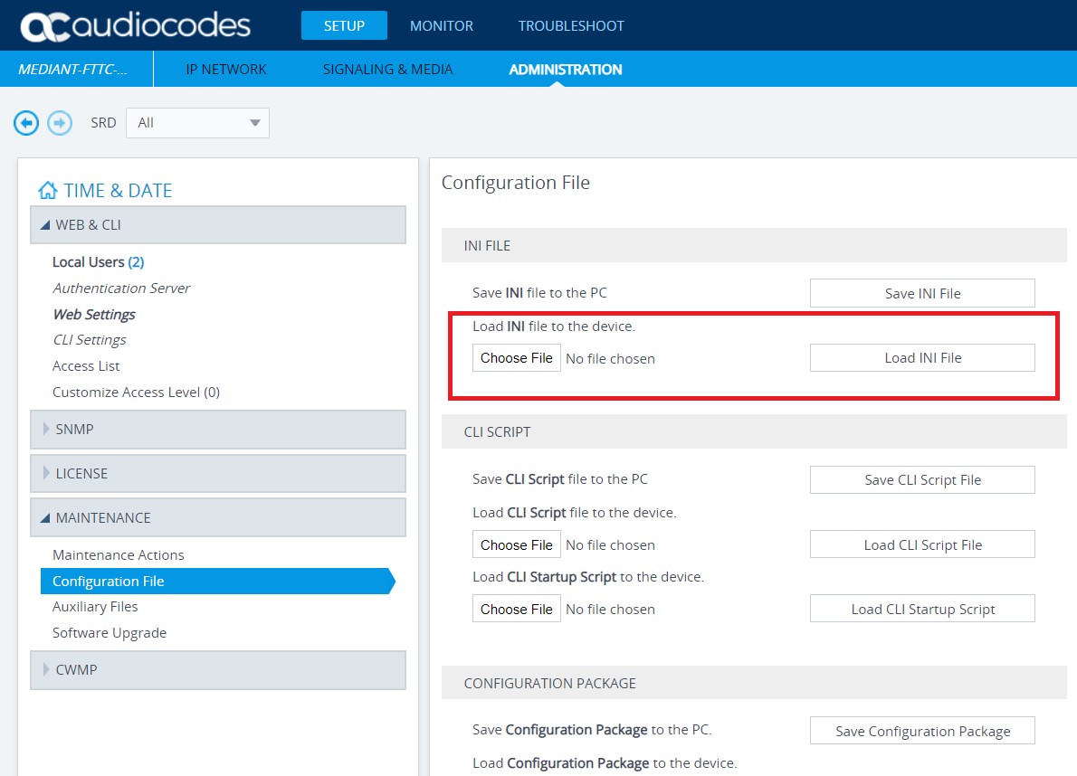Per poter caricare il file .ini è necessario eseguire l'accesso al router tramite interfaccia web. Muovendosi alla voce Setup→Administration e selezionando dal menu a sinistra Maintenance→Configuration file, è possibile caricare il file .ini dalla cartella di riferimento tramite i comandi Choose File e Load INI file