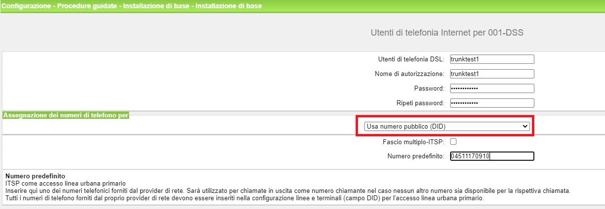 - Nella voce “Assegnazione dei numeri di telefono per” selezionare “Usa numero pubblico (DID)” e inserire username del trunk nelle voci “Utenti di telefonia DSL" e “Nome di autorizzazione” con relativa password
