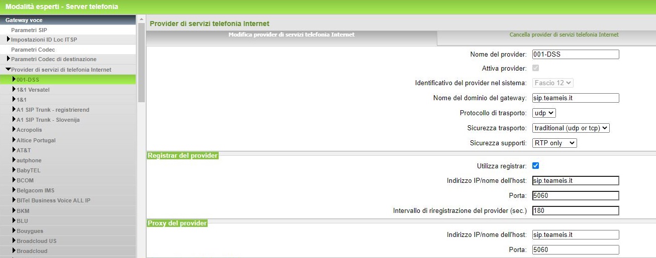 - Come protocollo di trasporto configurare UDP, in caso di deregistrazione dei trunk provare anche ad utilizzare TCP