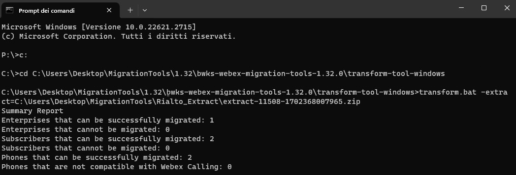 eseguire il file transformtool.bat compilando extract con il percorso del file .zip scaricato con l'extract toolC:\Users\utente\Desktop\MigrationTools\1.32\bwks-webex-migration-tools-1.32.0\transform-tool-windows>transform.bat -extract=C:\Users\utente\Desktop\MigrationTools\1.32\extract-11311-1701249204378.zip
